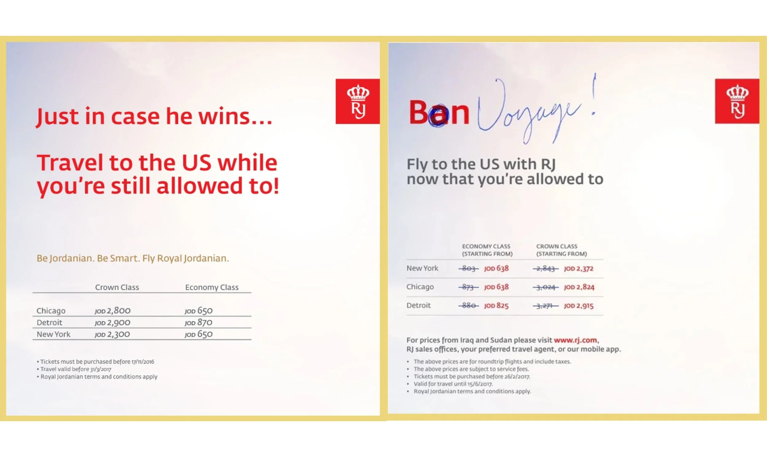 During the presidential election campaign of 2016, Trump proposed a ban on all Muslims travelling to the USA. Cheeky Royal Jordanian ran a campaign offering discounted flights “while you still can.” They followed this up with even greater price reductions when all talk of a ban was dismissed.