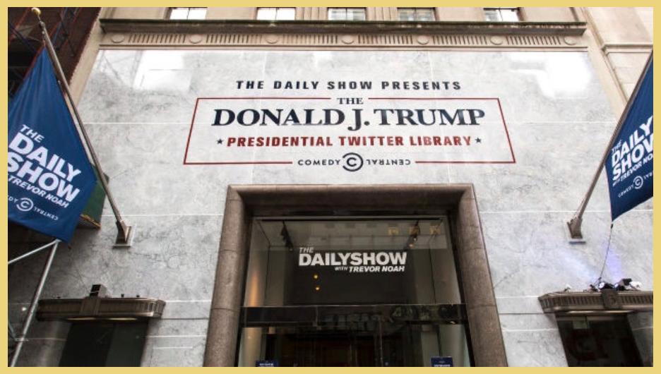 A pop-up museum around the corner from Trump Tower in New York was designed to reflect the libraries of past presidents but displaying Trump’s ‘greatest hits’ (“covfefe”) in gilt frames.